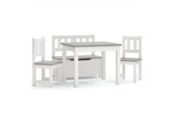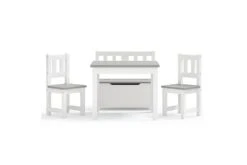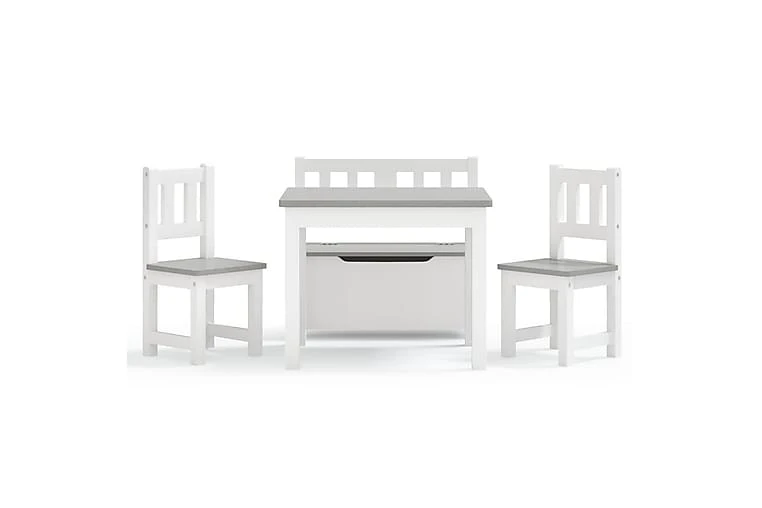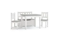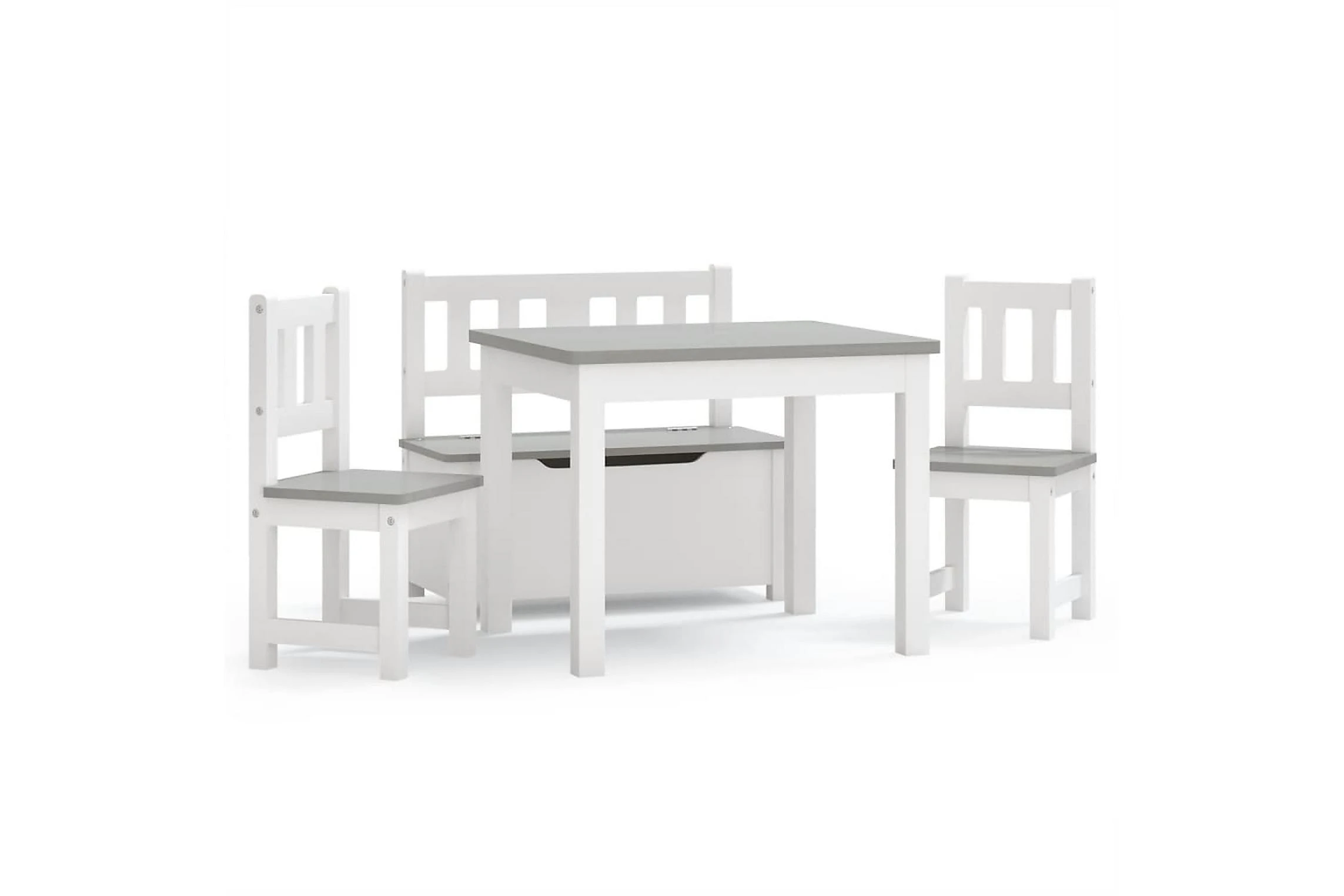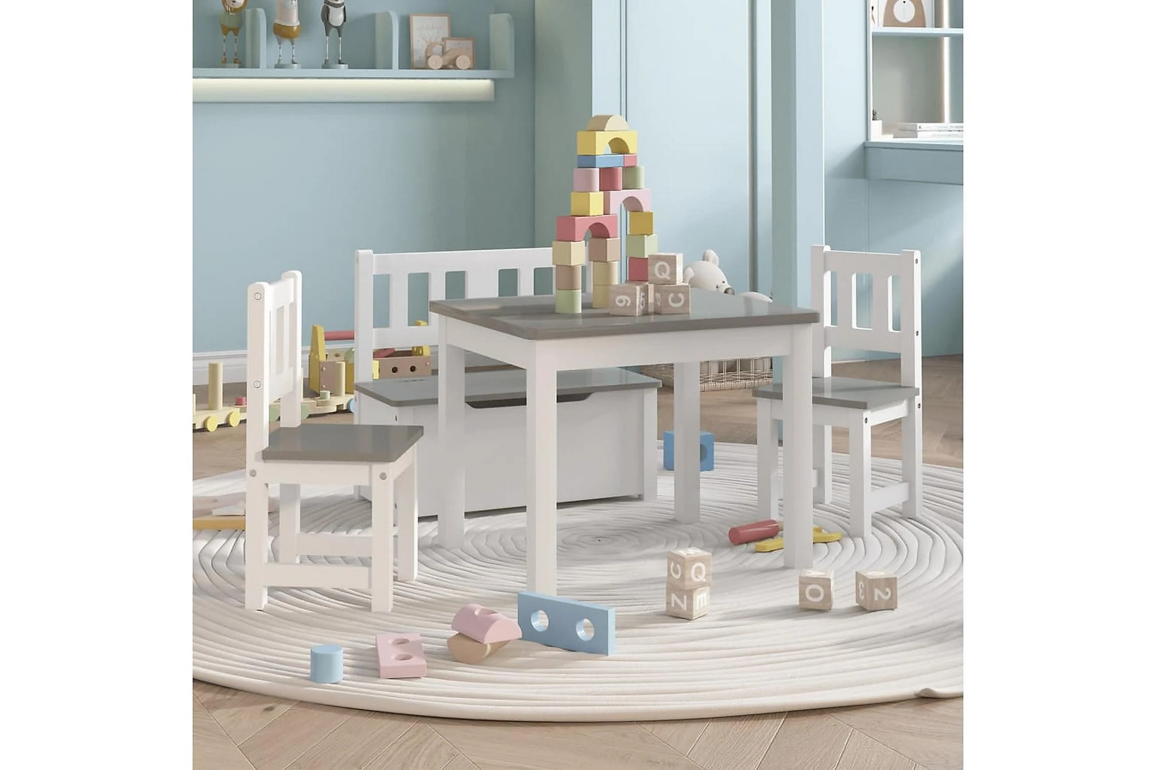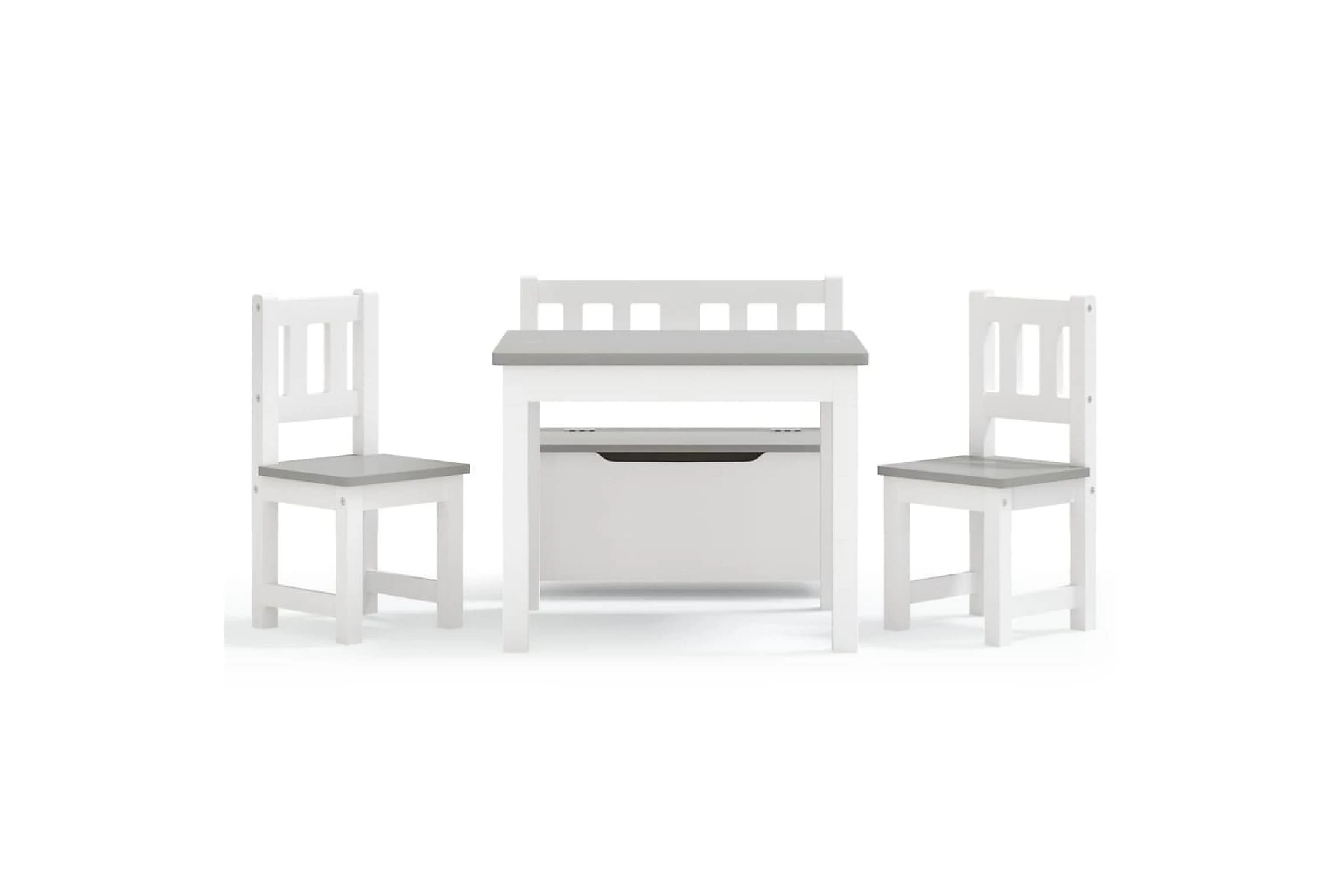 Dette bord- og stolsettet er bygget med slitesterk MDF i en giftfri malingsfinish, noe som gjÞr det trygt for barn samt enkelt Ä rengjÞre og vedlikeholde. Bordet kan brukes til Ä pusle, spille brettspill, hÄndverk og spise i tillegg til rutinemessig lesing og skriving. Benken har en perfekt kombinasjon av sitte- og oppbevaringsplass. Den integrerte oppbevaringskisten med lokk er ideell for Ä holde leker og andre ting godt organisert. Kantene og hjÞrnene pÄ bordet og stolene er avrundede, noe som sikrer barnas sikkerhet. Det er en perfekt setting for barna Ä bruke i hjemmet, skolen, barnehagen og sÄ videre.