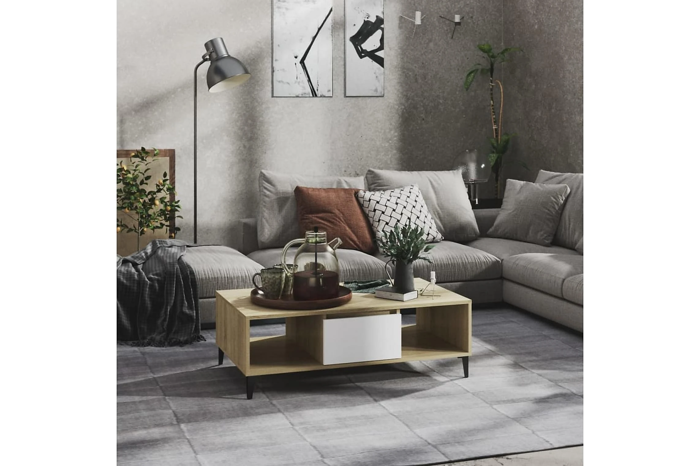 Dette stilige salongbordet i en industriell sjarm er et praktisk tillegg til hjemmet ditt.